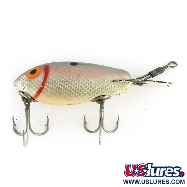 Tonos plateados y blancos cubren el cuerpo de madera de este señuelo clásico, que representa la era de fabricación entre 1949 y 1970. Con un peso de 10 g (1/3 oz), el Bomber 200 series fue diseñado para una profundidad de inmersión de hasta 2 m (6,5 ft) para alcanzar depredadores activos como el lucio, el aspio y la perca. El acabado muestra un intrincado patrón de escamas de malla, acentuado por una distintiva marca roja en las agallas, un único punto negro en el hombro y grandes ojos naranjas con pupilas negras. Una calificación de estado de 3/5 captura la historia auténtica del modelo, con ligeros signos de uso y pequeñas pérdidas de pintura visibles principalmente en las secciones del morro y la cola. Dos anzuelos triples están sujetos a la parte inferior de este ejemplar fabricado en EE. UU., identificado con el código de producto 8502. El babero metálico montado en la parte trasera permanece firmemente sujeto, siendo una característica técnica definitoria de este modelo flotante vintage.