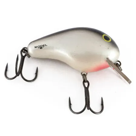Fabricado en madera de balsa de gran flotabilidad, este crankbait de poca profundidad de 1/2oz (14g) destaca la artesanía típica del material de pesca americano clásico. Los laterales gris plateado transicionan hacia un lomo oscuro con destellos de purpurina, acentuado por una mancha roja distintiva en la garganta y los clásicos ojos amarillos. Estampado claramente en el flanco con la denominación 'MODEL B' y marcado como 'BOMBER' cerca de la cola, este ejemplar es el BOMBER Balsa Model B BB5SL. Con una medida de 2 1/4" (6cm), el señuelo cuenta con un babero cuadrado transparente diseñado para profundidades de 0-0,9 m en lance. Este señuelo fabricado en EE. UU., identificado con el código de producto 9812, se presenta en un magnífico estado 5/5, con los herrajes y el acabado del cuerpo muy bien conservados. Dos anzuelos triples afilados están sujetos firmemente mediante robustas anillas abiertas, listos para la caja de pesca o exposición.