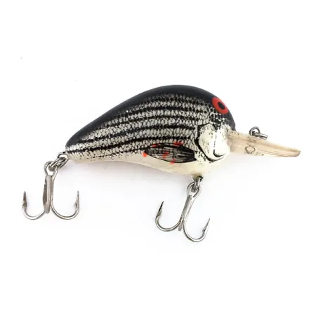 Adornado con un patrón clásico de escamas rayadas y llamativos ojos rojos, este ejemplar de 4 cm (1 1/2") representa un elemento básico en la categoría de light-cranking. Con un peso de 5,5 g (3/16 oz), el Bomber Fat A B04F, identificado por el código 9549, presenta un perfil compacto y de cuerpo ancho diseñado para el lanzado hacia especies como la perca y el cacho. El esquema de pintura muestra un lomo oscuro y sólido que transiciona hacia flancos plateados grabados miticulosamente con líneas horizontales para imitar pequeños peces pasto. Su babero redondeado transparente está diseñado para alcanzar profundidades de entre 1,2 - 1,8 m (4-6 pies), proporcionando una presentación fiable en medias capas. El hardware consta de dos anzuelos triples originales asegurados por robustas anillas abiertas. Este señuelo fabricado en EE. UU. está en condición 5/5, manteniendo un acabado impecable en su vientre blanco y flancos estampados.