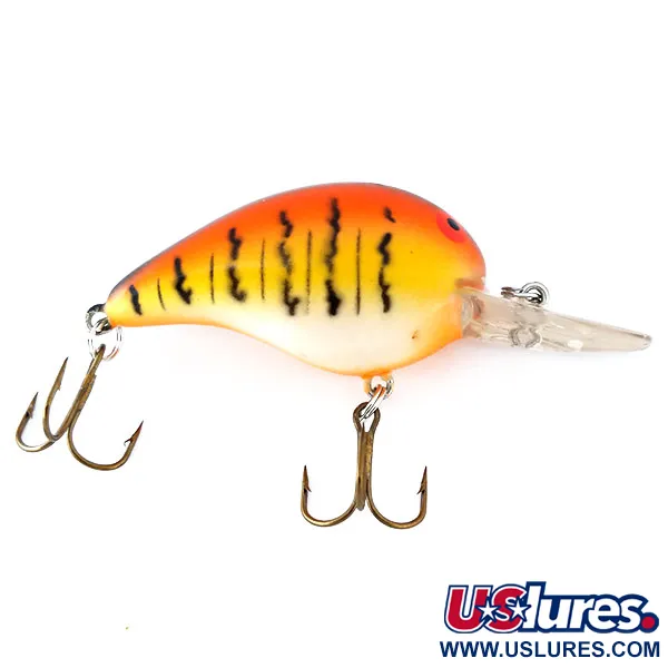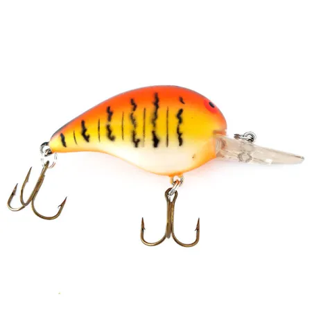El patrón Red Tiger define este crankbait vintage de 5 cm (2"), que muestra un gradiente naranja y amarillo de alto contraste acentuado por marcadas rayas verticales negras. Este Bomber Fat A B05F, identificado con el código de producto 11083, pesa 10 g (1/3 oz) y está diseñado para lanzarse a profundidades de 1,8-2,4 m (5,9-7,9 ft). El cuerpo presenta un perfil redondeado clásico con una franja negra profunda a lo largo del lomo y un vientre de color crema pálido. Su babero transparente está equipado con un robusto anilla abierta para la línea, acompañado por dos anzuelos triples originales con acabado en bronce. Con una calificación de estado de 5/5, el señuelo se conserva extraordinariamente bien, con ojos rojos y negros nítidos y líneas de pintura precisas. Fabricado originalmente en USA, este modelo flotante es un básico para la pesca de percas y cachos en medias profundidades. Los herrajes mantienen su integridad original en anillas y puntas de los anzuelos.