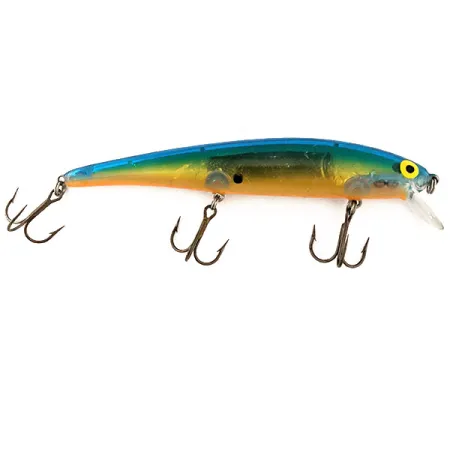 Costados dorados y naranjas que transicionan hacia un lomo azul profundo definen el patrón de color clásico XBBO de este minnow de fabricación estadounidense. Con una medida de 12 cm (4 3/4") y un peso de 12 g (2/5 oz), este ejemplar de Bomber Long A muestra el perfil esbelto que se convirtió en un elemento básico para los pescadores de lucioperca y lucio. Este modelo específico 11375 es un suspender, diseñado para quedar suspendido en la columna de agua a profundidades de lanzado de 0,6 - 0,9 m (2-3 ft) o profundidades de curricán de entre 1,2 - 2,4 m (4-8 ft). En el interior del cuerpo translúcido son visibles las cámaras de sonajero internas, que proporcionan un perfil acústico específico durante la recogida. Tres potentes anzuelos triples están montados mediante anillas abiertas resistentes, reflejando la durabilidad típica de la era de fabricación de Bomber en EE. UU. Los ojos amarillos con grandes pupilas negras proporcionan un punto focal de alto contraste frente a los brillantes flancos dorados. Este ejemplar está en condición 5/5, manteniendo su acabado original de fábrica y herrajes de plástico transparente.