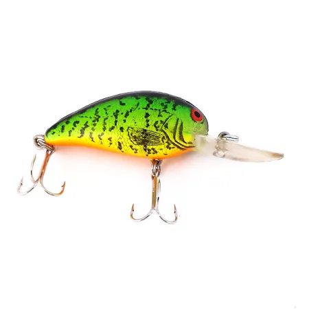 Con un peso de 1/3 oz (9 g), esta variante del Bomber Model A fabricada en EE. UU. cuenta con un acabado especializado diseñado para la visibilidad con poca luz. El cuerpo está recubierto con un patrón amarillo y verde fluorescente de alta visibilidad con motas oscuras que imitan escamas, diseñado específicamente para capacidades de brillo UV. Como se muestra en la imagen secundaria, la pintura reactiva a los rayos UV reacciona bajo ciertos espectros de luz, una característica técnica que Bomber integró para ayudar a los pescadores que buscan luciopercas o lucios en entornos profundos o turbios. Etiquetado como Model 6A, este crankbait está diseñado para alcanzar profundidades de 1,8-2,4 m (6-8 ft) tanto en lance como en curricán. Su cuerpo compacto de 5,5 cm (2 1/4") está equipado con un babero de natación largo de plástico transparente y dos juegos de poteras afiladas con acabado plateado. Con una calificación de 5/5, el ejemplar se mantiene en excelentes condiciones, conservando sus colores vibrantes y sus componentes originales. Un clásico ojo rojo proporciona un punto focal distintivo en la cabeza, manteniendo el aspecto tradicional de la serie Bomber al tiempo que incorpora tecnología moderna de brillo en la oscuridad bajo el código de producto 10480.
