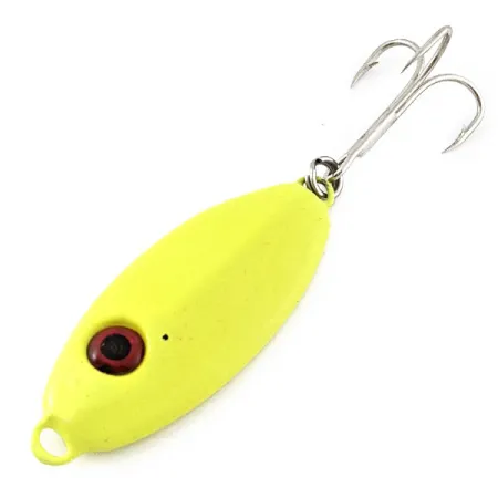 Con un acabado en amarillo UV de alta visibilidad, el cuerpo metálico de 5 cm (2") de esta cucharilla de jigging ofrece un perfil muy efectivo para presentaciones verticales en aguas profundas. Con el código de producto 20858, la Bomber Slab UV tiene un peso de 40 g (1 1/3 oz), lo que le permite alcanzar la zona de picada rápidamente. Su construcción de plomo presenta una forma de lágrima con un llamativo ojo rojo y negro situado cerca del morro. En la parte posterior, incorpora un anzuelo triple plateado unido mediante una anilla abierta, mientras que el morro incluye un enganche integrado para un montaje seguro. Bomber utilizó esta pintura reactiva a los rayos UV para maximizar la visibilidad en condiciones de poca luz o en capas de agua profundas. Este ejemplar se encuentra en excelente estado, sin signos visibles de desgaste, con una valoración de 5/5.