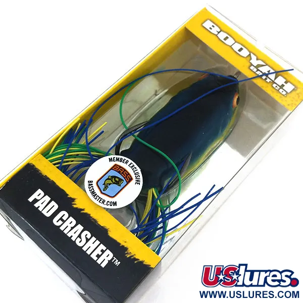 Un lomo de color azul oscuro a negro transiciona hacia una barriga amarilla brillante en esta rana de cuerpo hueco de 14 g (1/2 oz). Identificada con el código de producto 10841, la Booyah Pad Crasher está fabricada para navegar por vegetación densa y nenúfares. Las faldillas de silicona multicolor cuentan con hebras azules, verdes y amarillas, diseñadas para imitar las patas de un anfibio nadando. Este ejemplar en particular permanece sin usar en su embalaje original amarillo y negro de Booyah Bait Co., que lleva una pegatina distintiva de "Member Exclusive B.A.S.S." en la ventana de plástico transparente. Un par de anzuelos dobles afilados y orientados hacia arriba se asientan a ras del cuerpo blando para evitar enganches, estando listos para colapsar tras la picada. El perfil mide 6 cm (2 1/4"), manteniendo una presencia compacta que imita el alimento común. Pequeños ojos naranjas proporcionan un sutil punto de contraste contra la sección oscura de la cabeza. El peso interno está posicionado para ayudar a que el cuerpo aterrice correctamente en la superficie del agua, manteniendo las puntas de los anzuelos orientadas hacia arriba.