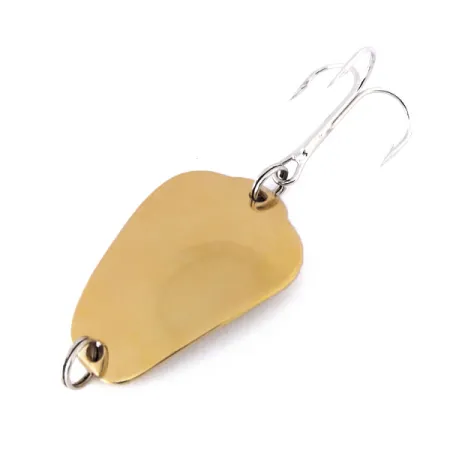 Con una longitud de 4 cm (1 1/2"), el cuerpo de metal estampado de este ejemplar brilla con un acabado dorado pulido. Esta Bug-Spoon de Tony Accetta es un clásico del diseño de aparejos estadounidense de mediados de siglo, pesando 14 g (1/2 oz) para un lanzado eficaz. El chapado en oro se conserva notablemente bien en toda su silueta en forma de hoja, que lleva el sello distintivo "BUG-SPOON" en la parte posterior. Como señuelo sin usar con una calificación de estado 6, la cucharilla mantiene su brillo original sin signos de manipulación o paso del tiempo. Bajo el código de producto 10595, el montaje consta de anillas abiertas de alta resistencia tanto en el morro como en la cola, sujetando esta última un gran anzuelo triple con acabado plateado brillante. La fabricación es sólida y compacta, reflejando los estándares de manufactura de su origen estadounidense.