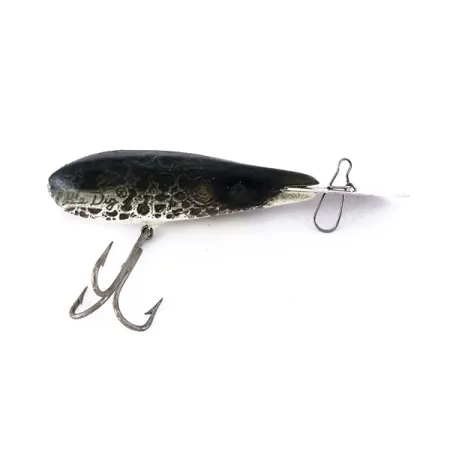 Más pesado de lo que parece con 7 g (1/4 oz), la estructura de goma maciza de este ejemplar es un sello distintivo del trabajo de Burke Flexo-Products Company de mediados del siglo XX. Con el código de producto 10129, el señuelo presenta un patrón moteado en blanco y negro de alto contraste diseñado para destacar en el agua. Un robusto babero metálico está fijado en la parte delantera para sumergir el cuerpo flotante de goma durante la recogida. Con una longitud de 6 cm (2 1/4"), el cuerpo conserva claramente los sellos originales "Big Dig" y "Burke" en los laterales. Los herrajes muestran ligeros signos de uso, con una calificación de estado de 3/5. Un único anzuelo triple está montado de forma segura bajo el vientre, lo que lo convierte en un ejemplo completo de la historia de la pesca de Michigan.