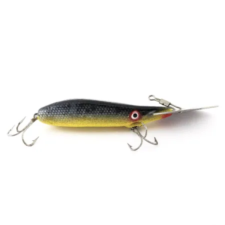 Con el nombre "BURKE BIG DIG" grabado claramente en su babero metálico sobredimensionado, este ejemplar muestra los métodos de fabricación exclusivos de la empresa Burke Flexo-Products, con sede en Michigan. Bajo el código de producto 23226, este señuelo flotante de 1/2 oz (14 g) está fabricado con el característico caucho blando de la marca, un sello distintivo de su producción desde 1950 hasta principios de los años 90. El patrón de color presenta un lomo negro intenso que transiciona hacia un vientre amarillo vibrante, rematado con una textura de escamas tipo panal de abeja muy definida. Un toque de rojo en la garganta y unos ojos blancos y rojos brillantes proporcionan puntos de ataque de alto contraste para lucios y grandes percas. Los herrajes se mantienen en óptimas condiciones, con dos anzuelos triples afilados y un esmerillón preinstalado en el babero. Calificado con un 5/5, el cuerpo sigue siendo flexible y el acabado de la pintura está extraordinariamente bien conservado. Este señuelo de goma de fabricación estadounidense representa una era en la que Burke se centraba en crear cebos con una sensación más natural y realista en comparación con los plásticos duros o la madera tradicionales.
