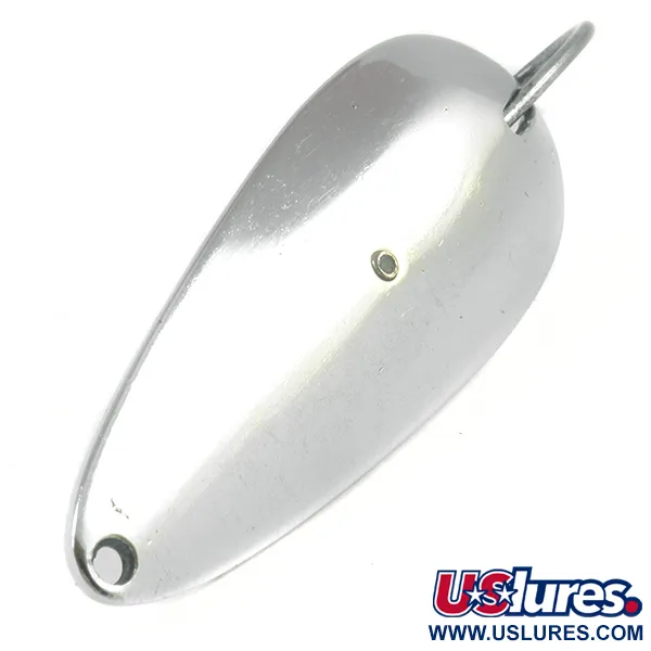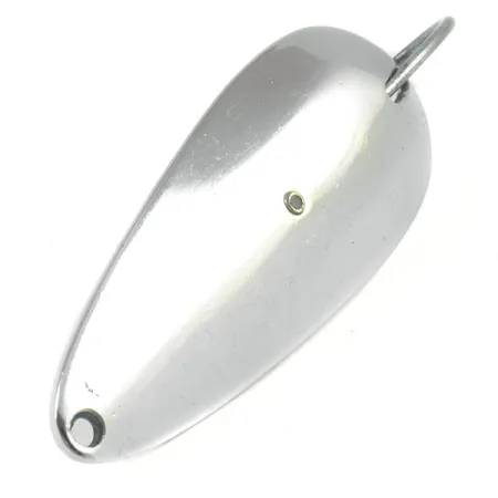 Pulida con un acabado de níquel de alto brillo, esta cucharilla de 5,5 cm (2 1/4") representa un pilar del diseño americano de señuelos antialgas de mediados de siglo. Con un peso de 10 g (1/3 oz), la Tony Accetta Weed Doger, identificada por el código de producto 3211, utiliza un robusto anzuelo simple integrado directamente en la parte cóncava. El anzuelo está asegurado por un tornillo distintivo que también ancla el protector antialgas de alambre, una característica diseñada para lanzar en nenúfares y vegetación densa. En el interior están grabadas claramente las marcas 'TONY ACCETTA' y 'WEED DOGER', confirmando su origen estadounidense. Este ejemplar está en condición 5/5, manteniendo una superficie de espejo en su cuerpo en forma de lágrima. El extremo estrecho incluye un orificio perforado con precisión para el sedal, mientras que el extremo ancho sirve de base para el conjunto del anzuelo fijo.