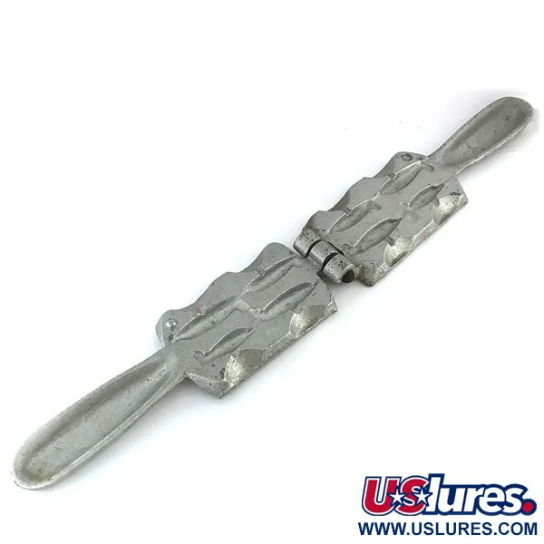 Claramente grabado en el cuerpo de metal fundido se encuentra el nombre C. PALMER junto con la marca EST. NEWTON PA, que identifica las raíces de este molde para plomos vintage de los USA. Con una medida de 20 cm (7 3/4") y un peso sustancial de 290 g (10,2 oz), esta herramienta fue diseñada para que el pescador produzca varios plomos en una sola colada. Al abrir las mitades articuladas se revelan varias cavidades mecanizadas con precisión para la fundición de plomo, mientras que los mangos integrados ofrecen un agarre firme. Encontrado en un estado 5/5, las superficies gris plata están notablemente limpias y la alineación de este ejemplar con código de producto 8369 sigue siendo precisa.