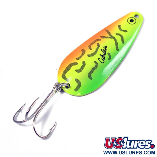Vibrantes patrones Fire Tiger adornan la cara convexa de esta cucharilla metálica de 7 cm (2 3/4"), pasando de un hombro naranja intenso a un vientre amarillo brillante y una cola verde lima. Con el código de producto 2190, este señuelo de la marca Cabela's es un testimonio de la fabricación clásica de EE. UU. La superficie frontal está detallada con rayas negras onduladas y una calcomanía de ojo negro distintiva, mientras que el reverso revela un acabado de níquel pulido para un máximo destello. El montaje cuenta con una robusta anilla abierta en la base, que asegura una potera reluciente. En cuanto a su conservación, el señuelo está en estado impecable, pareciendo completamente sin usar, lo que garantiza una puntuación de 5/5. Con un peso de 19 g (2/3 oz), la cucharilla es ideal para lances pesados o aplicaciones de jigging vertical.