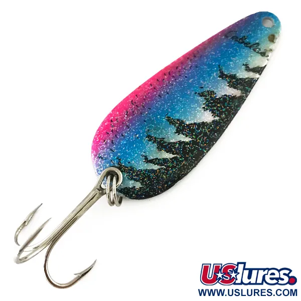 Un peso de 12 g le da a esta cucharilla ondulante la densidad necesaria para lances largos en aguas profundas o a través de las corrientes de los ríos. El esquema de color Trucha es visualmente impactante, con un vibrante degradado rosa neón y azul fuertemente acentuado con purpurina multicolor. A lo largo del borde del cuerpo de 5,5 cm, siluetas negras de árboles perennes proporcionan un detalle de alto contraste contra el fondo brillante. En la cabeza del señuelo, el nombre de la marca Cabela's está impreso en una tipografía negra limpia. El reverso de la cucharilla tiene un acabado en plata pulida brillante, destinado a crear un destello de luz que contrasta con el frente pintado. Este ejemplar fabricado en EE. UU., catalogado bajo el código de producto 8517, viene equipado con una anilla abierta duradera y una potera afilada. Con una calificación de 5/5, el señuelo está en excelente estado con un acabado que permanece brillante e intacto.