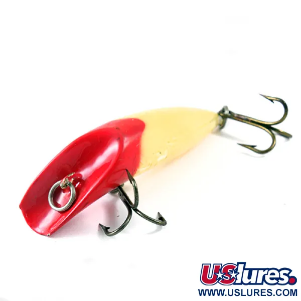 Con un peso sólido de 28g (1oz), este hallazgo vintage muestra el icónico diseño de cuerpo hueco que define el legado de la marca. La cabeza de color rojo intenso transiciona a un cuerpo blanco crema, un patrón de alta visibilidad preferido para atraer peces depredadores en diversas claridades de agua. Con una longitud exacta de 10cm (4"), este ejemplar bajo el código 1236 presenta la clásica cara cóncava que actúa como mecanismo de inmersión integral. El equipo consta de dos anzuelos triples montados en el vientre y la cola, y un robusto llaverito en el punto de sujeción de la línea. Su estado es de un respetable 4/5, manteniendo un acabado liso y brillante que los coleccionistas valoran. Fabricados en Canadá, estos señuelos son conocidos por su perfil distintivo y su peso ideal para el lanzado.