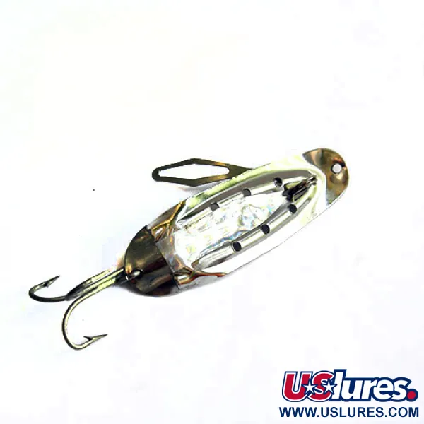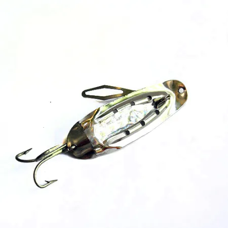 Con un peso de 14,4 g (1/2 oz), esta cucharilla ondulante de tamaño medio presenta un diseño antialgas distintivo para pescar en coberturas densas. El cuerpo de 8 cm (3 1/4") del Charger №3, catalogado bajo el código 0231, muestra el diseño innovador desarrollado originalmente por J. Rustowicz. Su acabado Nickel / Holograma utiliza un inserto central reflectante sujeto dentro de un marco de metal ranurado, diseñado para captar la luz desde varios ángulos durante una recogida constante. Un protector de alambre resistente protege el anzuelo triple, configurado específicamente para lanzar en vegetación moderada donde las ondulantes estándar podrían engancharse. Los herrajes y las superficies reflectantes están bien conservados, con una calificación de estado de 4/5 y solo ligeros signos de manipulación visibles. Este espécimen destaca la transición de la marca, ya que el diseño ha sido producido desde entonces por Lake Products. La distribución del peso de la cucharilla la convierte en una opción fiable para lances largos desde embarcación o desde la orilla.