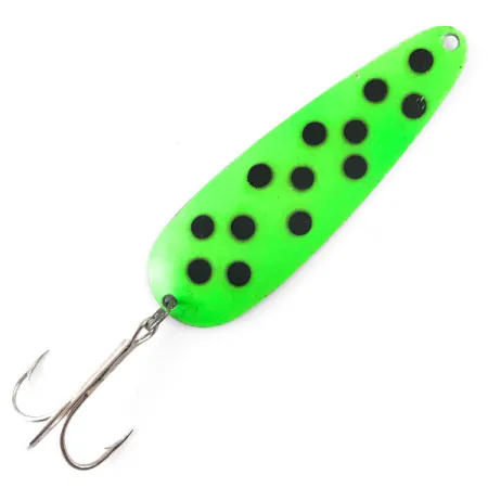 La pintura verde fluorescente le da a este Chippewa un impacto visual inmediato, especialmente bajo luz UV donde sus propiedades de brillo son más efectivas. Con una medida de 9 cm (3 1/2") y un peso de 21 g (3/4 oz), esta cucharilla modelo 4114 fue un elemento básico para los pescadores estadounidenses que buscaban un clásico confiable en la segunda mitad del siglo XX. Un anzuelo triple resistente está unido mediante una anilla abierta fuerte al cuerpo en forma de lágrima, que cuenta con una serie de puntos negros prominentes que proporcionan un alto contraste sobre la base neón. Al darle la vuelta al señuelo se revela la marca 'MADE IN USA' estampada directamente en el metal plateado, un sello distintivo de la fabricación de Worth de mediados de siglo. Con una calificación de 5/5, el acabado sigue siendo excepcionalmente vibrante y la integridad estructural es excelente. Lo suficientemente pesado para lances largos o curricán de profundidad, el cuerpo de 21 g (3/4 oz) está diseñado para alcanzar la profundidad deseada de manera eficiente.