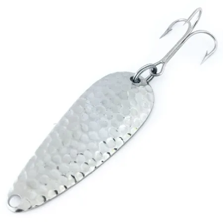 El niquelado martilleado crea una superficie altamente reflectante en esta cuchara Chippewa Steel Spoon de 10g (1/3 oz), una textura diseñada específicamente para captar la luz desde múltiples ángulos. Con una longitud de 5,5 cm (2 1/4"), este señuelo Worth es un ejemplo clásico de la metalurgia estadounidense de mediados de siglo que dominó las cajas de aparejos durante la segunda mitad del siglo XX. La cara frontal se caracteriza por su patrón hoyelado, mientras que el reverso revela un acabado liso estampado con el nombre de la marca y su origen USA. Este ejemplar, identificado con el código de producto 10965, conserva una apariencia brillante y limpia acorde con su calificación de estado 5/5. Viene montado con un único anzuelo triple grande conectado mediante un robusto anilla de llavero en la parte posterior. Estas cucharas se utilizaban para el lanzado o curricán en la pesca de lucios, black bass o truchas grandes en diversas condiciones de claridad del agua.