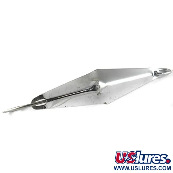 Con una longitud sustancial de 3 1/2" (9 cm), esta cucharilla anti-alga presenta un perfil de diamante alargado distintivo diseñado para navegar entre vegetación densa. James E. Clark, un fabricante estadounidense de larga trayectoria, produjo este espécimen específico bajo el código de producto 1051. El peso de 1/2 oz (15 g) está distribuido uniformemente sobre un acabado de níquel brillante que mantiene un alto grado de su brillo original. En cuanto al hardware, un único anzuelo fijo está integrado en el cuerpo, protegido por un fino protector de algas de alambre remachado directamente al metal. La superficie muestra solo ligeros signos de antigüedad y un manejo suave, lo que mantiene el estado en un sólido 4/5. Un resistente anillo de enganche se encuentra en la punta, asegurado a través de un troquelado limpio en la placa de metal.