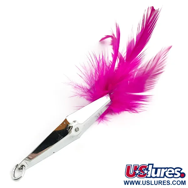 Con un peso de 5 g (3/16 oz), el cuerpo de esta creación de James E. Clark destaca por un vibrante penacho de plumas de color rosa fucsia. Con una longitud de 4,5 cm (1 3/4"), esta cucharilla Clark Spoon, identificada con el código 5856, luce un acabado cromado pulido típico de las cucharillas de alta calidad fabricadas en EE. UU. Su diseño antialgas se basa en un anzuelo simple oculto entre las plumas, pensado para pescar en zonas con vegetación sin engancharse. La superficie metálica reflectante y los componentes están bien conservados, mostrando solo ligeras marcas de uso acordes con una valoración de estado 4/5. Incorpora de fábrica una anilla abierta en el ojal delantero para facilitar la conexión directa con la línea.