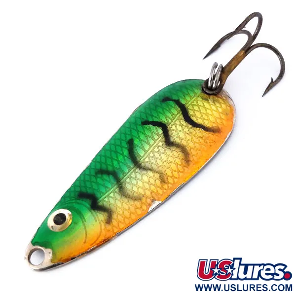 Bañada en un vibrante acabado Rainbow Perch, esta cucharilla ondulante de metal de 9 g (1/3 oz) refleja los principios de diseño clásicos de los aparejos americanos antiguos. El perfil de 5,5 cm (2 1/4") muestra un patrón de escamas en relieve que captura la luz bajo los tonos verdes y naranjas. Un ojo pintado en oro y negro cerca de la punta ofrece un blanco realista para los peces de presa. Identificada con el código de producto 10468, la cucharilla Wahoo Class Tackle presenta un reverso de metal liso con pequeñas manchas debidas a la edad, obteniendo una sólida calificación de estado de 4/5. Componentes de alta resistencia, que incluyen un robusto anillo partido y un anzuelo triple, hacen que este señuelo fabricado en EE. UU. esté listo para lanzar hacia coberturas o para el curricán de fondo.