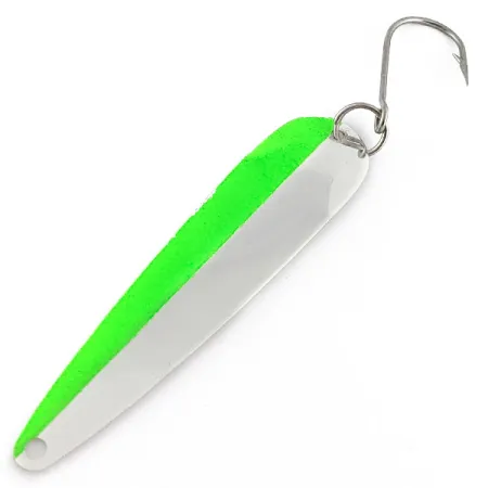 Con un peso de 3/16 oz (4,5 g), el perfil estilizado de esta cucharilla fabricada en EE. UU. está diseñado para presentaciones en aguas claras donde se requiere un destello específico. Una franja verde neón vibrante recorre el borde exterior del cuerpo de níquel pulido, proporcionando un contraste de alta visibilidad contra la superficie metálica reflectante. Este modelo Clear Water 101, identificado con el código de producto 23201, mide 3 1/4" (8 cm) de longitud y presenta la clásica forma cónica habitual en las cucharillas tradicionales de lanzado y curricán. La parte posterior del señuelo está equipada con un robusto anzuelo simple sujeto por una anilla abierta reforzada, una configuración preferida a menudo por los pescadores de trucha y salmón por sus clavadas sólidas y el menor riesgo de enganches. En el reverso, el nombre de la marca está grabado directamente sobre el acabado de níquel limpio. Este ejemplar mantiene un estado impecable de 5/5, sin mostrar signos de uso ni en las superficies pintadas ni en las chapadas. El orificio de sujeción de la línea en la punta permanece impecable y listo para el montaje.