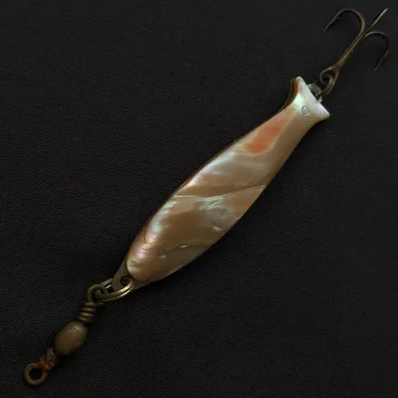 Con una longitud de 7 cm (2 3/4"), esta cucharilla Compac destaca la artesanía de la producción de artículos de pesca japoneses de mediados de siglo mediante el uso de una pieza sólida de nácar iridiscente. La concha natural está meticulosamente tallada para adaptarse al perfil pisciforme del señuelo y está anclada a la base metálica de tono plateado mediante dos remaches visibles. Con un peso de 14 g (1/2 oz), el modelo 19657 ofrece una masa significativa tanto para el lanzado como para la pesca al curricán de profundidad. El reverso metálico está pulido y es liso, contrastando con el brillo orgánico de la incrustación de abalón. En cuanto al montaje, el señuelo viene equipado con un robusto quitavueltas de barril en la parte frontal y un anzuelo triple bronceado en la cola. Este ejemplar en particular se encuentra en un estado excepcional, con una valoración de 5/5. Su origen japonés refleja un periodo en el que Compac era conocida por importar cucharillas decoradas de forma distintiva que combinaban el atractivo estético con la durabilidad funcional.