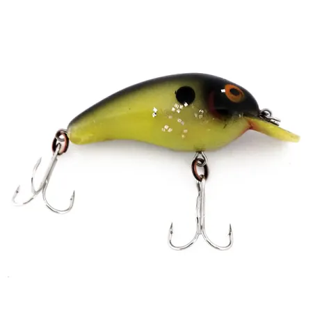Destellos plateados resaltan los flancos verde amarillentos de este crankbait de 7g (1/4oz), creando una estética clásica familiar para cualquier coleccionista del legado de Fred Young. Identificado con el código de producto 10268, este modelo de 5 cm (2") representa un diseño legendario que marcó la transición de la industria de la madera tallada al plástico moldeado. El esquema de pintura presenta un lomo negro de alto contraste sobre un cuerpo chartreuse, complementado por un prominente punto de ataque negro y un ojo con borde naranja. En su estado actual 5/5, el acabado está excepcionalmente limpio, preservando el brillo original y la integridad del babero integrado. Diseñado como un señuelo flotante con sonajero, alcanza profundidades de entre 0,6 y 1,2 m (2 - 4 pies) tanto en lanzado como en curricán. El montaje consta de dos anzuelos triples sujetos por anillas abiertas, con un robusto enganche metálico en el morro.