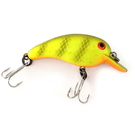Una pintura amarilla brillante con un patrón de escamas de panal clásico define el acabado de este crankbait compacto de 4 cm (1 1/2"). Con un peso de 4 g (1/8 oz), este Cotton Cordell Big O es un ejemplo perfecto del código de producto 11219, con el característico labio cuadrado diseñado para navegar a profundidades de hasta 0,9 m (3 pies). El cuerpo amarillo vibrante se complementa con un sutil vientre naranja y llamativos ojos rojos y negros, una combinación de colores a menudo preferida para la pesca de perca, aspio y lucio en diversas condiciones de agua. Este ejemplar fabricado en EE. UU. se mantiene en un estado excepcional, con una calificación de 5/5 por su superficie limpia y herrajes intactos. Dos anzuelos triples afilados están asegurados por anillas abiertas resistentes, listos para lanzar en coberturas poco profundas. El perfil de cuerpo corto y robusto del Big O ayudó a definir la categoría moderna de crankbaits de poca profundidad.
