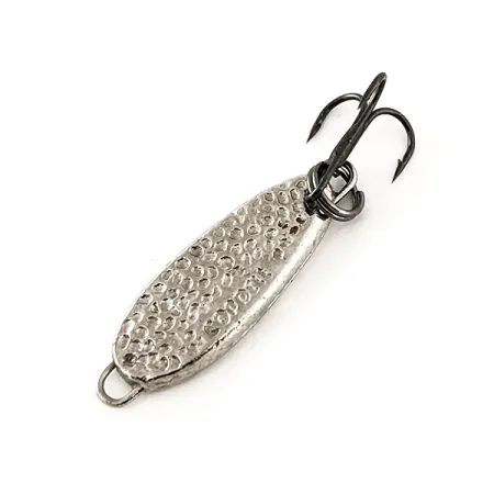 Un acabado de plata martillada con texturas profundas proporciona el principal atractivo visual a esta cucharilla Cotton Cordell C.C. Little Mickey, asegurando el máximo reflejo de la luz durante las presentaciones verticales. Con un peso de 3/16 oz (5,5 g), el cuerpo de metal compacto mide 1" (2,5 cm) y lleva el sello original "CORDELL" claramente grabado en el lado convexo. Este señuelo de jigging fabricado en Estados Unidos está equipado con un anzuelo triple de acabado oscuro asegurado por una anilla abierta de alta resistencia, mientras que el morro cuenta con un ojal integrado para la fijación directa de la línea. El ejemplar se encuentra en un estado 5/5, manteniendo su brillo original sin signos de desgaste en las superficies martilladas ni en los componentes. Diseñada específicamente para el jigging, la densidad del metal le permite alcanzar la profundidad rápidamente, mientras que su forma de lágrima mantiene la estabilidad durante el descenso. Su origen de fabricación está orgullosamente arraigado en los EE. UU., un hecho que se refleja en la construcción robusta y el estampado nítido de este modelo vintage. Código de producto: 11439.