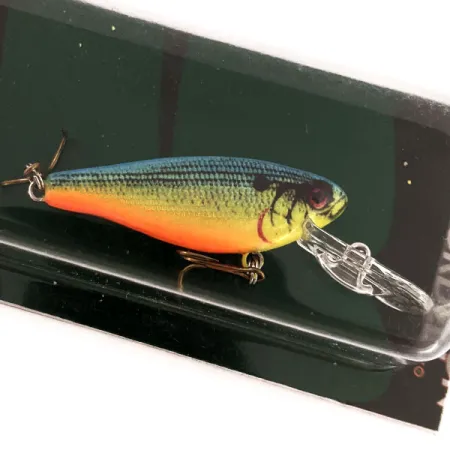 Un vientre rojo-naranja vibrante proporciona una alta visibilidad desde abajo en este Cotton Cordell C.C. Shad de 4 g (1/8 oz). Con una longitud de 4,5 cm (1 3/4"), este señuelo se identifica con el código de producto 12920 y está diseñado como un señuelo flotante con sonajero (rattling) específicamente para especies como la perca y el lucioperca. El patrón de color presenta un lomo azul intenso que transiciona a flancos escamados amarillo-verdes, marcados por una mancha oscura tras la agalla. Este ejemplar no ha sido usado, mostrando un babero transparente y herrajes originales con acabado en bronce. Dependiendo de la técnica, alcanza profundidades de 1,8 m (6 ft) en lance o hasta 4 m (13 ft) en curricán. Su construcción delgada de costados planos es un vínculo directo con el legado de fabricación de Cotton Cordell en Hot Springs, Arkansas, con este envase reflejando los estándares de producción de 2012.