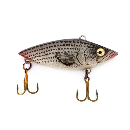 Con un patrón rayado realista que imita a un pequeño white bass, este Cotton Cordell Hot Spot de 9g (1/3oz) es una pieza destacada de la historia de los aparejos americanos. Con una longitud de 6 cm (2 1/4"), el señuelo presenta un perfil lipless clásico con frente plana y sujeción de línea superior, diseñado para trabajar en profundidades variables. La pintura de este ejemplar, identificado con el código de producto 10264, permanece notablemente nítida, mostrando puntos horizontales negros definidos y un ojo amarillo vibrante que proporciona un punto focal claro para los depredadores. La atención al detalle de Cotton Cordell es evidente en el sutil acento rojo bajo la barbilla y el degradado de plata a gris en la zona dorsal. El hardware consta de dos anzuelos triples de bronce originales, que se mantienen limpios y bien sujetos. Con una calificación de estado de 5/5, el acabado está excepcionalmente preservado sin desgaste visible, lo que lo convierte en un ejemplo ideal para pescar lucioperca, lucio, trucha o salmón tanto en lance como en cacea.