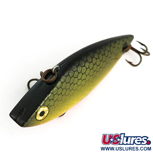 Con un peso de 1/2 oz (14 g), un lipless crankbait hundido como este Cotton Cordell TH Spot UV sigue siendo una herramienta fundamental para la pesca de perca o lucioperca. Identificado con el código de producto 5935, el señuelo mide 3" (7,5 cm) y presenta un detallado patrón de escamas verdes sobre un cuerpo dorado. El vibrante vientre naranja adquiere un brillo de alta visibilidad bajo luz UV, como muestra la fotografía especializada, lo que ayuda en entornos de poca luz. Un punto negro característico se sitúa cerca de la cola para imitar una presa común, complementado por un gran ojo amarillo en la parte frontal. La construcción es sólida, con dos anzuelos triples bien conservados y una calificación de estado 5/5. Fabricado en EE. UU., el cuerpo incluye un sistema de sonajero interno diseñado para el lance y técnicas de recuperación en aguas profundas.