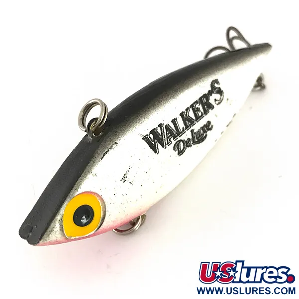 Con una longitud de 7,5 cm (3"), este señuelo lipless hundido muestra el perfil clásico de la artesanía temprana de Cotton Cordell. Los flancos plateados están acentuados con finas motas negras, pasando a un lomo negro sólido y una barbilla rosa suave. Catalogado con el código 7751, el señuelo cuenta con un diseño con sonajero lastrado de 14 g (1/2oz). Este espécimen específico se mantiene en excelentes condiciones (5/5), conservando la nítida inscripción negra 'WALKER'S Deluxe' estampada en el lateral. Diseñado para lance o curricán a profundidad variable, cuenta con una anilla de sujeción superior y dos robustos anzuelos triples. El fabricante de Arkansas utilizó un llamativo ojo pintado de amarillo con pupila negra para añadir un punto focal a la cabeza.