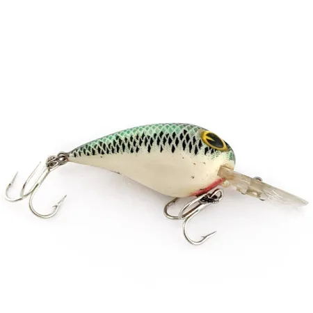 El patrón de escamas en el lomo revela un diseño clásico de bass en verde y negro en este ejemplar de 5 cm (2"). Cotton Cordell lastró este Wiggle O con 7 g (1/4 oz), un estándar para lances de precisión en estructuras cerradas. El babero transparente lleva grabado el nombre "Wiggle O", asegurando que su identidad permanezca intacta. Sus grandes ojos amarillos con pupilas negras profundas dominan el perfil frontal, situados justo encima de una garganta con tintes rojos que añade contraste al vientre en tono crema. Con el código de producto 23246, este señuelo conserva sus componentes originales, incluyendo dos juegos de anzuelos triples. El estado está calificado como 5/5, exhibiendo un acabado bien conservado que resalta el intrincado detalle de las escamas. El plástico moldeado y los esquemas de pintura detallados definen esta era de fabricación para los pescadores de bass.