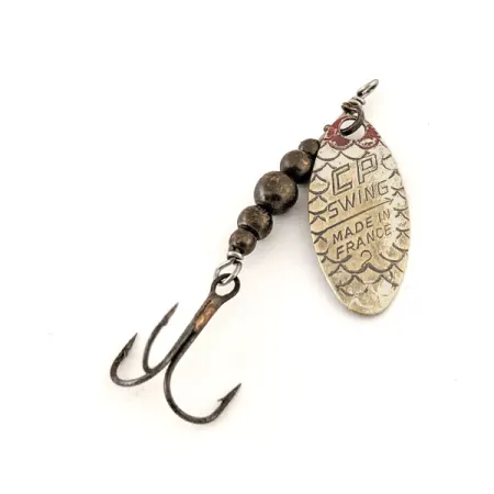Los tonos plata y latón caracterizan esta clásica cucharilla giratoria francesa, un elemento básico para los pescadores de truchas y percas. Con un peso de 2,7 g (3/32 oz) y una longitud de 4,5 cm (1 3/4"), la CP-Swing 2 (código 12625) presenta una icónica pala texturizada claramente grabada con su origen francés. Este ejemplar específico tiene una calificación de estado de 5/5, mostrando un acabado limpio en la pala plateada y en las cuentas de cuerpo graduadas de color bronce. El montaje consta de un eje central robusto que remata en un anzuelo triple afilado, manteniendo la integridad del diseño original. Su factura refleja los estándares de fabricación de mediados de siglo que hicieron que estos señuelos fueran muy valorados para el lance ligero.