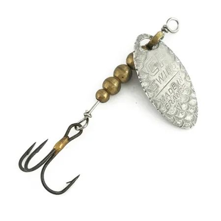 El estampado en la hoja plateada revela un origen francés, un sello distintivo de estas clásicas cucharillas giratorias CP-Swing a menudo distribuidas en América del Norte. Este señuelo en línea de 1 3/4" (4,5 cm) presenta un patrón de escamas texturizado en la hoja plateada, que se combina con un cuerpo compuesto por cuatro cuentas de latón graduadas. Con un peso de 3/32 oz (2,5 g), el señuelo está equilibrado para lances de precisión en corrientes ligeras o aguas tranquilas. El ejemplar, registrado bajo el código de producto 7293, se encuentra en excelente estado con una calificación de 5/5, mostrando claramente las letras "MADE IN FRANCE" y "CP SWING" en el metal. Una única potera está montada en la parte trasera, unida a un eje de alambre que termina en un ojal superior limpio para el bajo de línea. El contraste entre la hoja plateada y el cuerpo de latón se mantiene nítido y brillante en todo el conjunto.