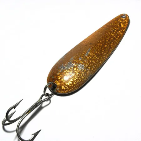 Con una longitud de 3 1/2 pulgadas (9 cm), esta cucharilla ondulante representa el lado más robusto de la línea Eppinger. Este modelo específico de Dardevle, identificado con el código de producto 0306, presenta el distintivo acabado Crystal (Golden Scale), un patrón texturizado de tonos ámbar diseñado para captar la luz en diversas condiciones de agua. Con un peso sustancial de 1 oz (28 g), proporciona el lastre necesario para presentaciones en aguas profundas o lances a larga distancia. En el lado cóncavo se observa el clásico sello DARDEVLE profundamente grabado en el metal, seña de identidad de la empresa fundada por Lou Eppinger en 1906 en Detroit, Michigan. El anzuelo triple original permanece unido mediante un robusto anilllo abierto, listo para el agua. El acabado de escama dorada muestra cierto desgaste natural en la superficie texturizada, lo que permite que el metal base brillante se asome en algunos puntos, especialmente en la sección media y los bordes. Este ejemplar está limpio y mantiene una fuerte presencia estética, mereciendo una calificación de estado de 3/5. Es una pieza auténtica de la historia de la pesca estadounidense, que refleja la misma durabilidad que hizo que estos señuelos formaran parte de los kits de supervivencia de la aviación militar.
