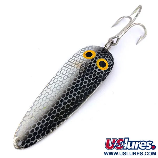 Con una longitud de 9 cm, la cara de esta cucharilla ondulante está decorada con un patrón de panal de escamas grises y dos prominentes ojos amarillos y negros situados cerca del anzuelo. El cuerpo pesado de 28 g está troquelado con "DARDEVLE DETROIT USA" en su reverso cóncavo, lo que lo identifica como un modelo clásico de Eppinger de su época de fabricación original. Este ejemplar, identificado con el código de producto 10038, se mantiene en condiciones 4/5, mostrando una superficie reflectante bien conservada en su perfil oblongo. Un gran anzuelo triple está unido al extremo lastrado mediante un anilla de llavero de acero, diseñada para soportar la presión de depredadores pesados. El extremo estrecho presenta un orificio de sujeción perforado limpiamente para una conexión directa o la adición de un clip.