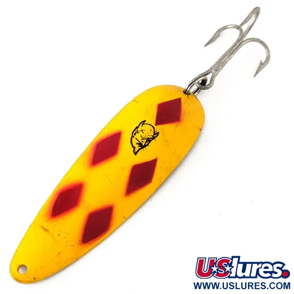 Cinco llamativos rombos rojos destacan sobre el acabado amarillo brillante de esta cucharilla ondulante vintage. El reverso en tono latón presenta el icónico sello "DARDEVLE DETROIT, U.S.A.", reflejo del legado de las primeras producciones de Lou Eppinger en Michigan. Con un peso de 28g (1oz) y una longitud de 9cm (3 1/2"), su sólido cuerpo metálico proporciona el peso necesario para lances a gran distancia. El logotipo central de la cabeza de diablo negro permanece nítido, un sello de identidad de la marca desde principios del siglo XX. El estado de conservación general es alto, mostrando una superficie limpia y herrajes intactos, lo que le otorga una calificación de 5/5. Un anzuelo triple está sujeto en la parte posterior, diseñado para aplicaciones pesadas en agua dulce. La pintura muestra la calidad clásica esperada de los modelos antiguos de Eppinger, catalogados bajo el código de producto 11124.