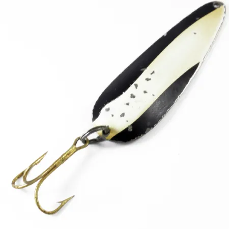 Un nítido estampado «DARDEVLE DETROIT U.S.A.» en el reverso de níquel pulido sitúa este ejemplar en la era anterior a 1959, antes de que Lou Eppinger trasladara la producción de Detroit a Dearborn. Esta cucharilla pesada pesa 28 g (1 oz) y mide 9 cm (3 1/2"), lo que la convierte en una herramienta sólida para lanzamientos a larga distancia o curricán. La cara frontal muestra un patrón de rayas blancas y negras de alto contraste, acentuado por un moteado gris-negro en la franja blanca central. Su característica forma cóncava es el resultado de los moldes de fabricación exclusivos de Eppinger en EE. UU., un diseño que ha sido un elemento básico en las cajas de pesca durante más de un siglo. El señuelo está equipado con una robusta anilla abierta metálica y su anzuelo triple original en tono latón. El acabado muestra un carácter auténtico con pérdida de pintura en los bordes y marcas superficiales dispersas, lo que resulta en una calificación de estado de 3/5. Este esquema de color particular, combinado con el acabado de níquel reflectante en la parte posterior, era una elección tradicional para los pescadores que requerían alta visibilidad, como se indica en los registros del código 3494.