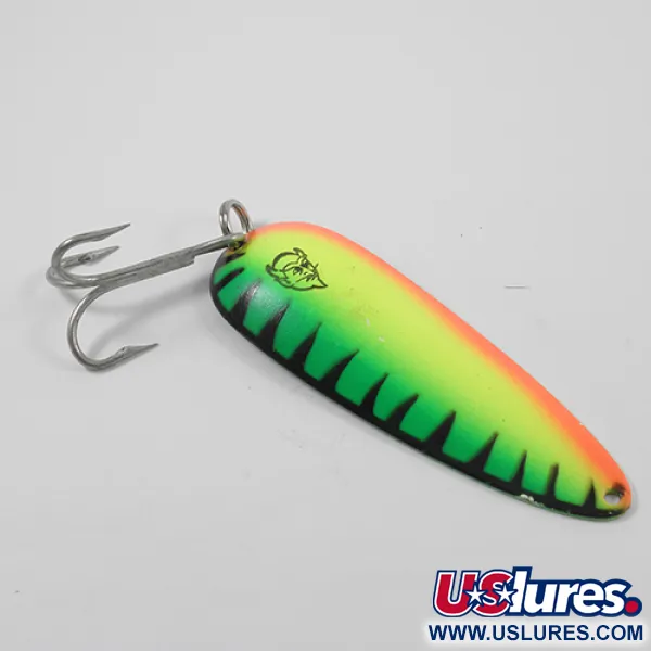 Con un peso de 1 oz (28 g), esta clásica cucharilla ondulante de Eppinger presenta el icónico patrón Fire Tiger en su cuerpo de 3 1/2" (9 cm). El acabado es un degradado vibrante de amarillo neón y verde, bordeado por una llamativa línea naranja y acentuado con rayas verticales negras en un lado. En el reverso de latón, se encuentran claramente visibles los sellos auténticos "DARDEVLE" y "EPPINGER DETROIT" junto con la designación del peso. Este ejemplar específico lleva el código de producto 2697 y muestra el clásico logotipo de la cabeza del diablo en el lado pintado. El montaje consiste en un anzuelo triple robusto en tono plateado conectado por una anilla abierta fiable. Este señuelo se encuentra en un estado 5/5, lo que demuestra el cuidado meticuloso que se espera de una pieza de colección bien conservada. La construcción de latón proporciona un destello natural que complementa los colores brillantes de la parte superior al pescar en diversas condiciones de luz.