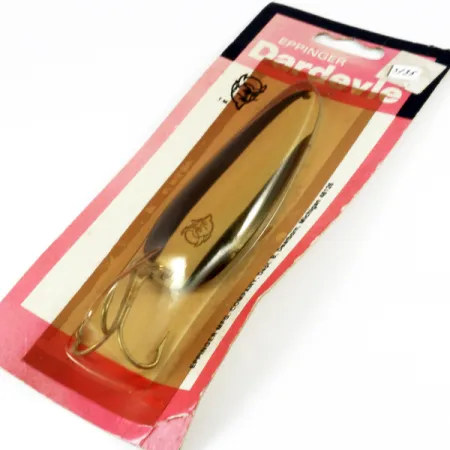 Con un peso considerable de 28 g (1 oz), esta cucharilla de metal pesado está diseñada para lances de larga distancia y presentaciones en aguas profundas. El Eppinger Dardevle, con código de producto 3135, mide 9 cm (3 1/2") de largo y presenta el icónico logotipo de la cabeza de diablo estampado en su superficie metálica. Este ejemplar específico tiene un acabado en Negro / Blanco / Níquel y se presenta en su embalaje vintage original con un cartón rosa y blanco que refleja la época de fabricación en Dearborn, Michigan. El señuelo no ha sido usado y mantiene una calificación de estado de 6. Equipado con un gran anzuelo triple montado de fábrica, está fabricado con los troqueles patentados que Lou Eppinger perfeccionó hace más de un siglo. El reverso del cartón incluye la dirección de Eppinger Manufacturing Company en Schaefer Highway, un detalle importante para los coleccionistas de aparejos fabricados en Michigan. La construcción de metal pesado asegura que el señuelo se mantenga profundo en la zona de ataque durante una recogida constante.