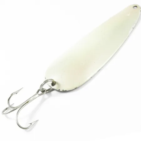 Una pintura de color marfil recubre la cara convexa de esta cucharilla de 28g (1oz), lo que la convierte en una opción destacada para aguas claras. Al dar la vuelta al señuelo se descubre el acabado de níquel pulido, claramente marcado con el sello «DARDEVLE DETROIT U.S.A.». Con una longitud de 9cm (3 1/2"), este clásico de Eppinger, con código de producto 3344, tiene el peso necesario para lances de larga distancia. El acabado marfil muestra algunos signos leves de uso con un desgaste menor en los bordes, obteniendo una calificación de estado de 4/5. Cada detalle, desde el cuerpo oblongo cóncavo hasta la fijación con anilla abierta para el afilado anzuelo triple, remite a los troqueles de fabricación propios utilizados por la familia Eppinger desde los inicios de la marca en Michigan. El reverso de color níquel proporciona un destello reflectante nítido frente al frontal marfil mate, una combinación de colores que sigue siendo un básico para los pescadores de peces depredadores.
