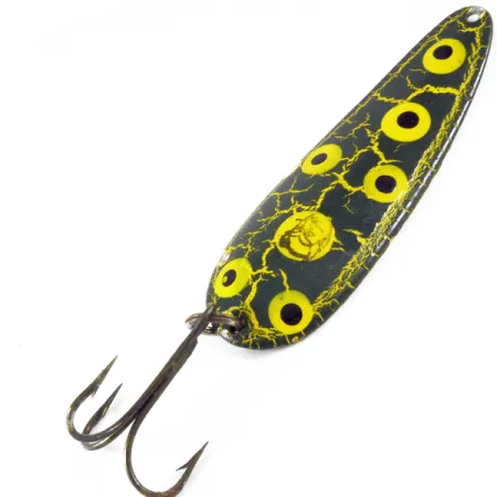 Con un peso de 28 g (1 oz), esta clásica cucharilla ondulante representa el legado perdurable de los orígenes de Lou Eppinger en Detroit en 1906. El patrón de color Frog presenta una llamativa base amarilla decorada con una textura craquelada verde oscuro y audaces motas en forma de ojos, en contraste con un acabado de níquel brillante en el reverso. Con una medida de 9 cm (3 1/2"), la forma oblonga característica de la cucharilla y su profunda superficie cóncava son el resultado de los moldes de fabricación exclusivos de Eppinger, diseñados para proporcionar un movimiento de bamboleo distinto al lanzar o pescar al curricán. Bajo el código de producto 3498, este señuelo en particular se mantiene en excelente estado, recibiendo una calificación de 5/5. En el dorso pulido, los sellos auténticos de "DARDEVLE", "EPPINGER" y "U.S.A." son claramente legibles, identificándolo como una pieza genuina de fabricación estadounidense. El equipo incluye un robusto anzuelo triple asegurado por una anilla abierta. Aunque Lou Eppinger trasladó las operaciones a Dearborn en 1959, el diseño fundamental permanece inalterado porque ha demostrado su eficacia durante más de cien años. Incluso el gobierno de los Estados Unidos reconoció la fiabilidad de este diseño, incluyendo las cucharillas Dardevle en los kits de supervivencia militar durante la guerra.