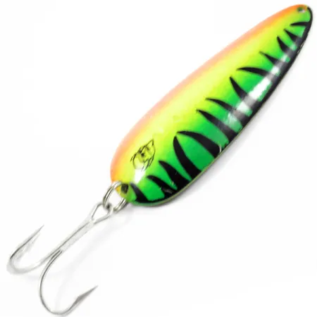 La brillante coloración FireTiger crea un perfil de alta visibilidad en esta cucharilla ondulante de 28g (1oz). La cara frontal transita por vibrantes tonos de naranja, amarillo y verde, puntuados por nítidas franjas verticales negras y el icónico sello del logotipo. Al dar la vuelta al señuelo, encontramos un acabado de latón pulido, donde el peso está grabado limpiamente en el metal, una marca distintiva de los moldes patentados que Eppinger ha utilizado desde que sus operaciones se trasladaron a Dearborn, Michigan, en 1959. Con una medida de 9cm (3 1/2"), la distintiva forma cóncava de la cucharilla está diseñada para una recogida constante durante el lanzado o el curricán. El montaje consiste en un robusto anzuelo triple de tono plateado asegurado por una anilla abierta. Este espécimen, identificado con el código de producto 3776, mantiene un acabado excepcionalmente limpio, mereciendo una calificación de 5/5.