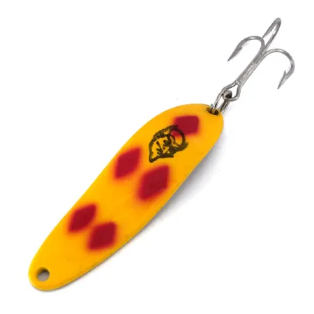 Cinco diamantes rojos resaltan sobre el acabado amarillo brillante de esta cucharilla de 5,5 cm (2 1/4"), identificándola como el icónico patrón Five of Diamonds. Esta Dardevle Cop-E-Cat 7300, código de producto 10163, presenta el famoso logotipo de la cabeza del diablo estampado claramente en la cara frontal. Con un peso de 10g (1/3oz), el señuelo está construido con un cuerpo oblongo y cóncavo che genera un movimiento de bamboleo específico durante una recogida lenta. El reverso revela una parte posterior de cobre limpio, con las marcas „COP-E-CAT“ y „DETROIT“ estampadas, reflejando las profundas raíces del fabricante en Michigan desde que Lou Eppinger comenzó a fabricar señuelos a mano en 1906. Este ejemplar se encuentra en una condición 5/5, mostrando una pintura vibrante y una potera afilada con acabado plateado unida mediante una anilla abierta resistente. Al igual que todas las cucharillas Dardevle, se fabricó en los EE. UU. utilizando matrices propias para garantizar la curvatura exacta necesaria para un lanzado o curricán efectivos. La combinación del frente amarillo y el dorso de cobre proporciona un contraste visual que los pescadores experimentados suelen preferir cuando pescan en aguas de diversas claridades.