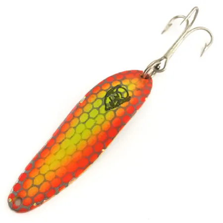 Con un peso de 10 g (1/3 oz), esta cucharilla ondulante tiene el peso necesario para lances profundos o curricán constante. La Eppinger Dardevle Cop-E-Cat 7300 UV presenta un llamativo patrón de escamas en nido de abeja con naranjas y amarillos vibrantes sobre una base de níquel de alto brillo. Con una longitud de 5,5 cm (2 1/4"), su cuerpo oblongo refleja el diseño clásico americano que Lou Eppinger creó en Michigan. Bajo la luz UV, la sección central amarilla se transforma en un brillo verde intenso, proporcionando alta visibilidad en aguas turbias o profundas. Este ejemplar, identificado con el código 6377, se encuentra en estado 5/5, conservando el acabado limpio y brillante de un señuelo bien preservado. Viene equipada con un anzuelo triple afilado unido mediante un robusto anclaje de anilla. El frente lleva el icónico sello Dardevle, asegurando su lugar como una pieza genuina de la historia de la pesca de Detroit.