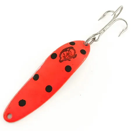 Motes en un acabado negro profundo contrastan fuertemente con la vibrante cara rojo-naranja fluorescente de esta clásica cucharilla ondulante. Con un peso de 1/3 oz (10 g), este modelo es una Dardevle Cop-E-Cat 7300 UV, que lleva el icónico sello de la cabeza del diablo que Eppinger ha utilizado desde sus inicios en Michigan. Con una longitud de 2 1/4" (5,5 cm), el señuelo presenta la forma oblonga y la superficie cóncava características que los moldes propiedad de la empresa han producido durante más de un siglo. Bajo la luz UV, el acabado fluorescente reacciona con un brillo intenso de alta visibilidad, representando una evolución moderna de los patrones tradicionales de la marca nacida en Detroit. La parte posterior está acabada en níquel, una elección clásica para mantener la visibilidad en diferentes claridades del agua. Este señuelo en particular está en condiciones 5/5, mostrándose notablemente limpio con sus componentes originales y su anzuelo triple intactos. La serie Cop-E-Cat está diseñada para el lanzado o curricán, utilizando su construcción distintiva para crear un movimiento de bamboleo característico en la columna de agua. Código de producto 6436.