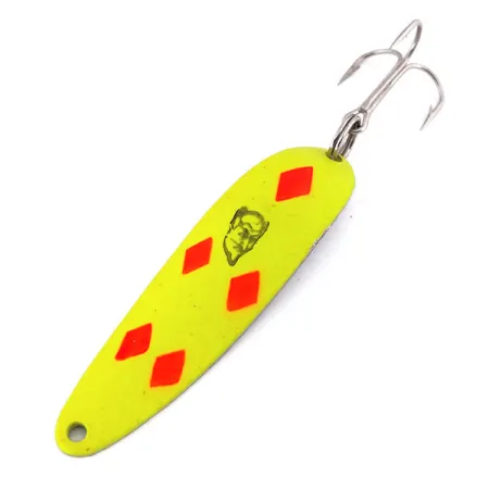 Con un peso de 1/2 oz (14 g) y una longitud total de 2 1/2" (6,5 cm), el clásico patrón Five of Diamonds de esta Eppinger Dardevle Cop-E-Cat 7400 es un elemento básico en cualquier caja de señuelos. Este ejemplar específico, identificado con el código de producto 10210, presenta un acabado UV Glow/Fluorescente que mantiene una alta visibilidad incluso en aguas profundas o tomadas. El icónico logotipo de la cabeza del diablo está perfectamente centrado en la superficie cóncava amarilla, flanqueado por cinco diamantes rojos bien definidos. En estado 5/5, la cucharilla conserva su brillante acabado de fábrica y está equipada con herrajes originales de alta calidad, que incluyen una anilla abierta robusta y un anzuelo triple. Eppinger fabrica estas cucharillas ondulantes en Michigan desde 1906, utilizando moldes propios para asegurar el peso y el equilibrio precisos requeridos para su característico movimiento errático. Aunque el Five of Diamonds estándar es legendario, esta versión fluorescente aporta una ventaja técnica adicional para el lanzado o curricán en condiciones de poca luz. Su construcción metálica refleja la durabilidad de fabricación estadounidense que ha mantenido a estos señuelos en las colecciones de pesca durante más de un siglo.
