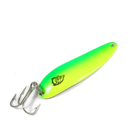 Con una longitud de 6,5 cm (2 1/2") y un peso de 14 g (1/2 oz), esta cucharilla ondulante ofrece la resistencia que los pescadores esperan de Eppinger, con sede en Michigan. La superficie frontal está acabada en un degradado amarillo y verde brillante, acentuado por el pequeño logotipo de la cabeza del diablo cerca del ojal del anzuelo. En el reverso, el niquelado está claramente grabado con "COP-E-CAT 7400 DETROIT USA", una marca que vincula este modelo con la historia temprana del fabricante en Detroit antes de su traslado en 1959. Este ejemplar específico, bajo el código 2098, mantiene una calificación de estado de 5/5. Su forma cóncava está diseñada para el lance y la cacea, mientras que el acabado de alto contraste garantiza visibilidad en diversas condiciones de luz. Un gran anzuelo triple está sujeto mediante un robusto anillote en la parte posterior.
