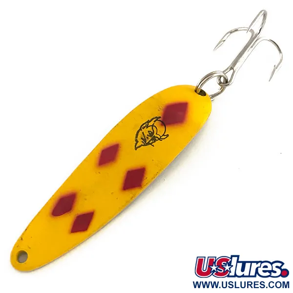 Grabado claramente en el reverso de tono latón, "COP-E-CAT 7400 DETROIT U.S.A." vincula esta cucharilla de 14 g con su herencia de Michigan. Esta Eppinger Dardevle Cop-E-Cat 7400 específica, identificada con el código de producto 9166, luce el acabado clásico Five of Diamonds: una cara de color amarillo brillante adornada con cinco llamativos rombos rojos. La superficie frontal también incluye el reconocible logotipo negro de la cabeza del diablo, sinónimo de la fundación de Lou Eppinger en Detroit en 1906. Con una longitud de 6,5 cm, la cucharilla presenta un cuerpo oblongo y cóncavo diseñado para el lance y el curricán. El ejemplar se encuentra en excelente estado (5/5), con la pintura frontal impecable y un reverso metálico brillante y bien conservado. Conserva su anilla abierta y su anzuelo triple originales, lo que refleja la calidad del material de pesca estadounidense de mediados del siglo XX.