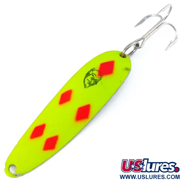 Un revestimiento amarillo fluorescente brillante define la base de esta cucharilla ondulante metálica, que presenta el legendario patrón Five of Diamonds en un rojo vibrante. Con un peso de 1/2 oz (14 g) y una longitud de 2 1/2" (6,5 cm), esta Eppinger Dardevle Cop-E-Cat 7400 UV está fabricada con los moldes patentados que Lou Eppinger popularizó en Michigan. El acabado de alta visibilidad se ve reforzado por un brillo reactivo a los rayos UV, lo que hace que el señuelo destaque en condiciones de poca luz o en aguas profundas. Cerca de la parte superior se encuentra el clásico sello de la cabeza del "Diablo", una firma de la calidad de fabricación estadounidense que Eppinger ha mantenido desde 1906. Este ejemplar en particular se encuentra en excelente estado (5/5), con sus componentes originales y un anzuelo triple afilado intacto. Identificada con el código de producto 10817, la cucharilla utiliza su forma oblonga y cóncava para crear una presencia específica durante una recogida lineal.